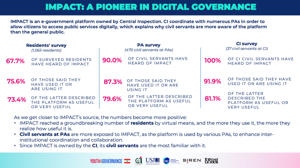 What really stood out to me was the number of respondents who had heard of IMPACT. We live in a society that has high levels of poverty and where many people have had only the most basic education. And yet, despite these factors, there is clearly an embryonic digital culture in Lebanon that needs to be nurtured, with 67% of surveyed residents saying that they had heard of IMPACT, and 76% of those saying they had used it. Usage of IMPACT does, however, fall as distance from urban areas increases, so to avoid the risk of a digital divide, investment in digital infrastructure must also include remote areas.